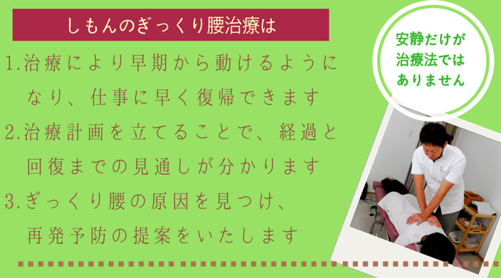 カイロプラクティックしもんでは、ぎっくり腰に限らず、必ず治療計画を立てます。また、施術後には、予想される原因と治療法、今後の計画についてお話しをします。もちろん、ご都合や、お住まいが豊橋市内ではないので通うのに時間がかかる等あると思いますので、話し合ってより現実的な日程と方法を考えます。ただし、あまりにもこちらの提示する計画とかけ離れた計画になりますと、結果が出ないことがよく起こります。数週間ほどは、ある程度通院できるような時間を作っておくことをお勧めします。