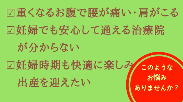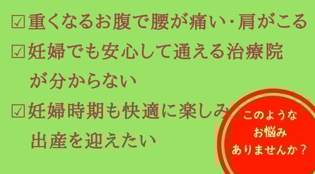 お腹の重さで、腰や背中の筋肉は凝り固まって血行不良を起こしています。お腹に負担がかからないようにソフトな手技で筋肉をやわらかくしていきます。また、この時期は姿勢が変わるので肩こりや頭痛も起きやすくなります。首や肩もケアすることで快適に妊娠中を過ごせるようになります。